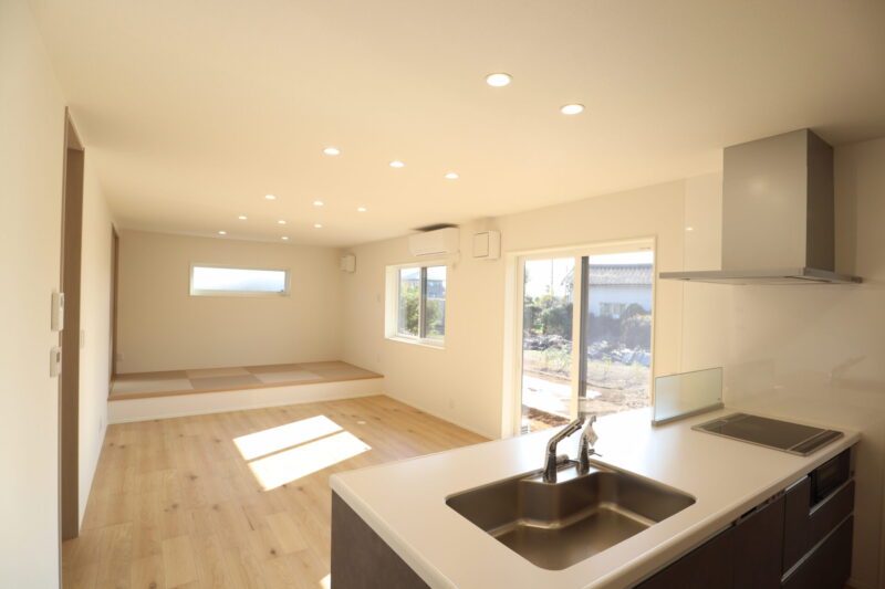 広いリビングには小上がりの和室もあり、キッチンからお子様の様子も確認できる間取りとなっております。