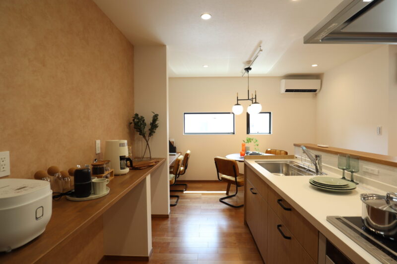 キッチンの背面にはキッチンシェルフを設置し、家電の配置にも困らない設計に。